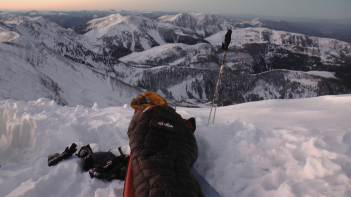 Les conditions étaient vraiment bonnes pour un bivouac sur une crête. Mais la neige, très légère, s'infiltrait volontiers entre le matelas et le duvet. Malgré les 1680g à porter, j'en tire un bilan positif car l'impact thermique et le confort étaient au rendez-vous.
