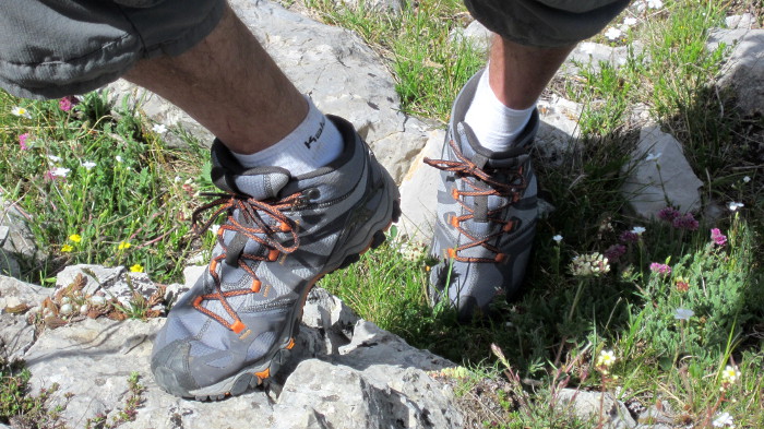A la descente, dans des larges sentes caillouteuses, je remarque que la semelle protège bien des chocs avec les cailloux. La sensation reste fine sans que l'on souffre des aspérités du chemin. Cette donnée restant variable selon le poids du randonneur. La souplesse de la chaussure permet de courir si on le souhaite, les appuis restent précis. Le modèle mid me semble prédisposé pour des parcours en montagne, avec petit sac à dos et bâtons.