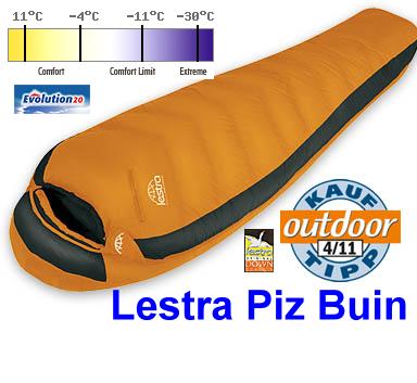 La marque Lestra avait attiré mon attention par son offre de sacs de couchage adaptée aux utilisations 3/4 saisons dans nos massifs montagneux. Un petit examen des divers produits ont arrêté mon choix sur un duvet assez peu connu, mais présentant des garanties de thermicité intéressantes et un sérieux de fabrication : le Piz Buin 1000, un sac garni de 1000 grammes de duvet d'oie.