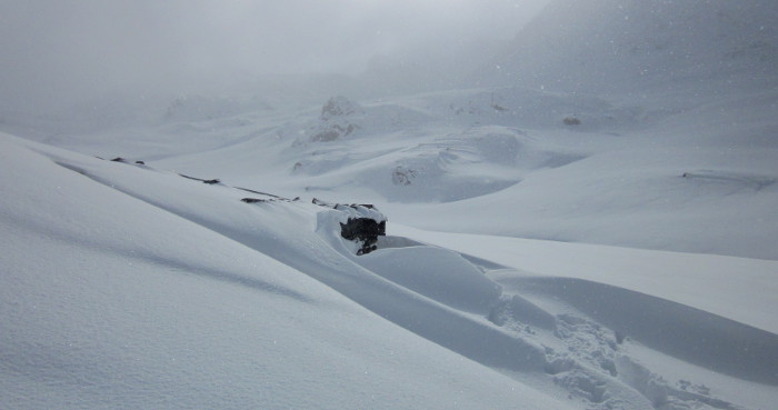 Voici la "cabane" du col (2530m) en février 2013 où a eu lieu le test de thermicité. Il fallait commencer par la trouver, et ensuite la dégager (voir vidéo ci-dessus). En tous cas cet abri est en ruine, il faudra trouver autre chose pour les prochains tests...