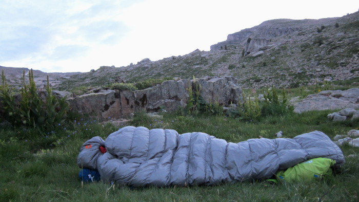 Voulant limiter le volume et le poids de mon portage, le Valandré Mirage s'est avéré être le bon duvet pour un sac à dos de 35 litres. Le bivouac a eu lieu sur le matelas Mountain 2 de Lafuma version courte de 1.22m et une belle pelouse, le tout dans un décor de rêve. Mais avec un ciel nuageux, chargé d'humidité au coucher, et un changement de pression en cours de nuit, je me suis vite retrouvé avec une rosée importante sur le duvet... J'ai donc enfilé un sursac par-dessus. Au réveil, bonne surprise, le duvet était toujours sec et impeccable à l'intérieur. L'humidité est restée entre le duvet et le sursac et s'est même transformée en givre, preuve que les températures de la nuit ont été plus froides que prévues. Habillé d'une simple peau en laine et d'un collant, j'ai passé une nuit thermiquement correcte. Ce nouveau test confirme les performances thermiques du Mirage en bivouac "à la belle" en saison estivale (avec sursac dans le cas présent). L'absence de collerette, une nouvelle fois, alimente mes regrets pour ce duvet, qui, déjà intéressant pourrait être plus efficace encore.